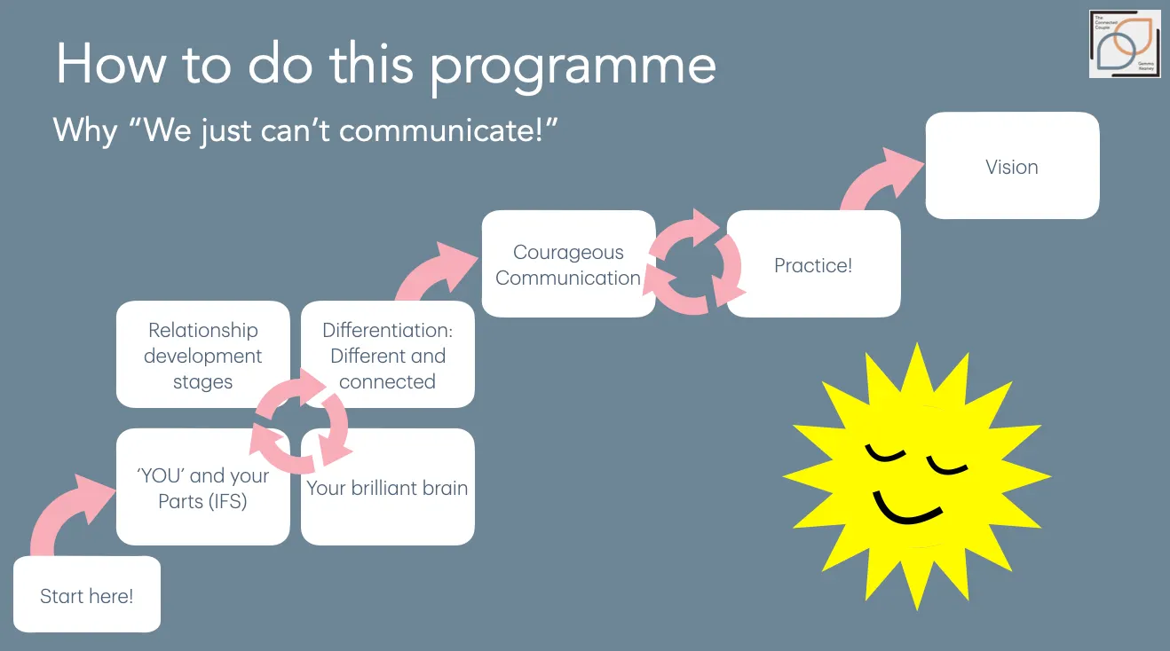 This educational programme introduces key frameworks used in modern couples therapy - namely Internal Family Systems (IFS), and Intimacy From the Inside Out (IFIO).Developmental Model of Couples Therapy, and translates them into structured learning designed to help individuals and couples better understand their relational dynamics.